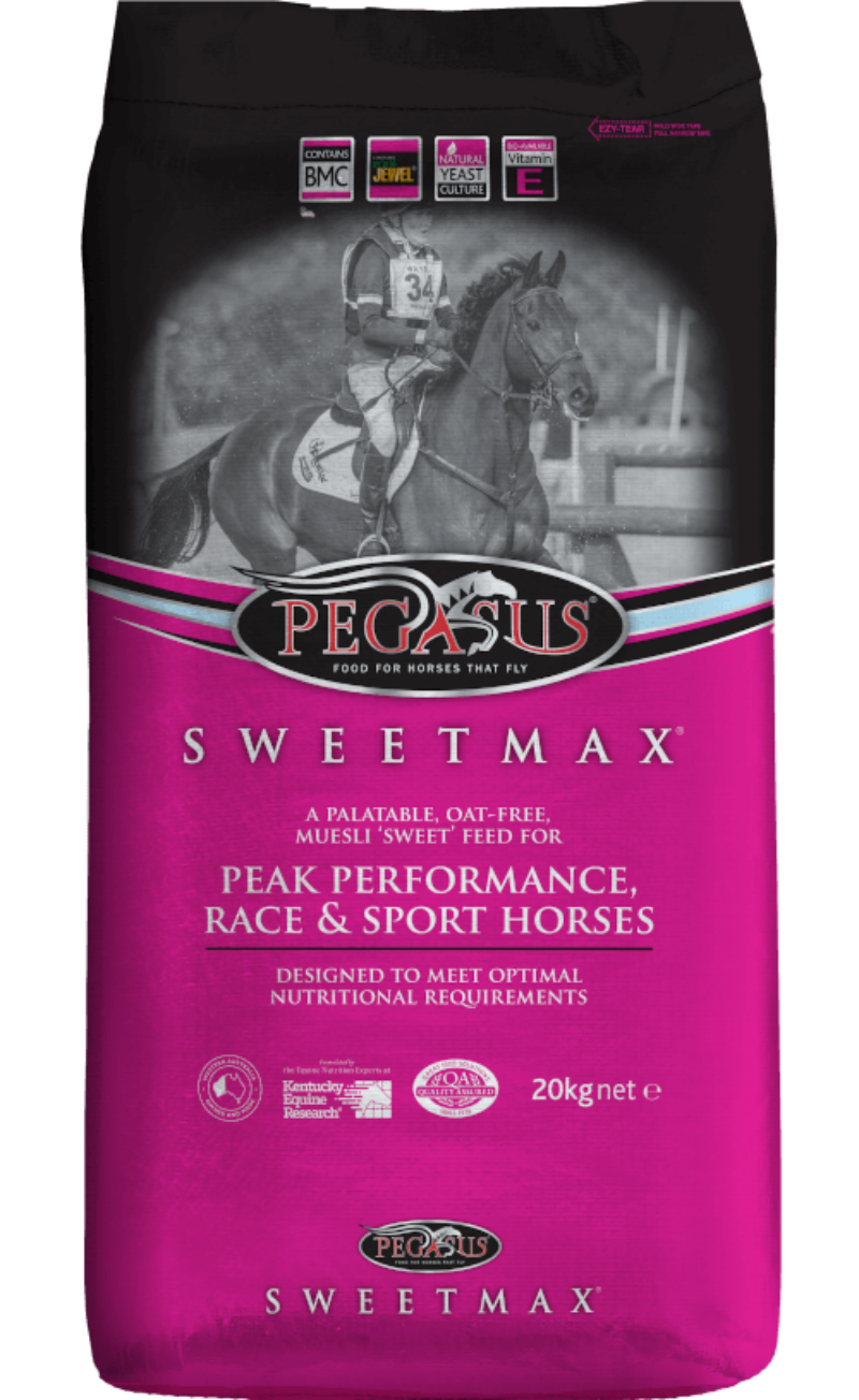 Sweetmax has a concentrated formula that allows you the flexibility to add your own grains or Sweetmax can be used as the sole concentrate for ‘good doing’ horses or those requiring an oat-free diet. It contains a nutrient pellet to provide all the essential nutrients, vitamins and minerals for optimal health and fitness of equine athletes. Pegasus Sweetmax contains the research-proven Buffered Mineral Complex (BMC) - to support bone mineralisation, gastric buffering and hindgut buffering. Read the research and learn more here.